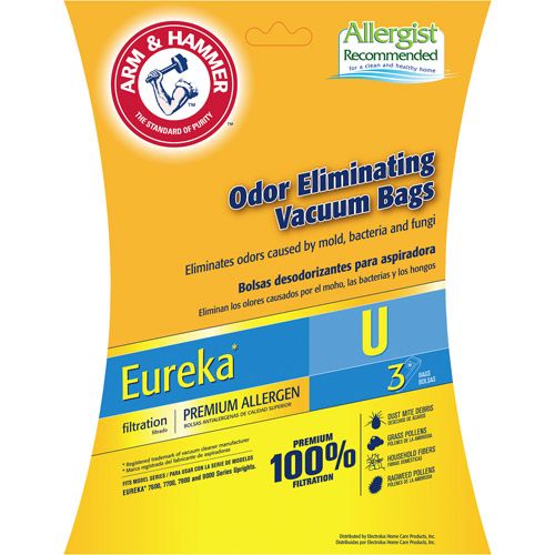 Eureka Arm and Hammer Odor Eliminating Style U Vacuum Cleaner Bags. Arm & Hammer bags work while you vacuum, removing household odors along with dirt, dust and pet dander to help improve indoor air quality. These premium allergen vacuum bags retain up to 100 percent of dust mite debris, pollens and other particles. As dirty air passes through the bag, baking soda particles neutralize odor bearing chemicals. For use in Eureka 7600, 7700, 7900 and 9000 series uprights vacuum cleaners. 3 pack of vacuum cleaner bags.